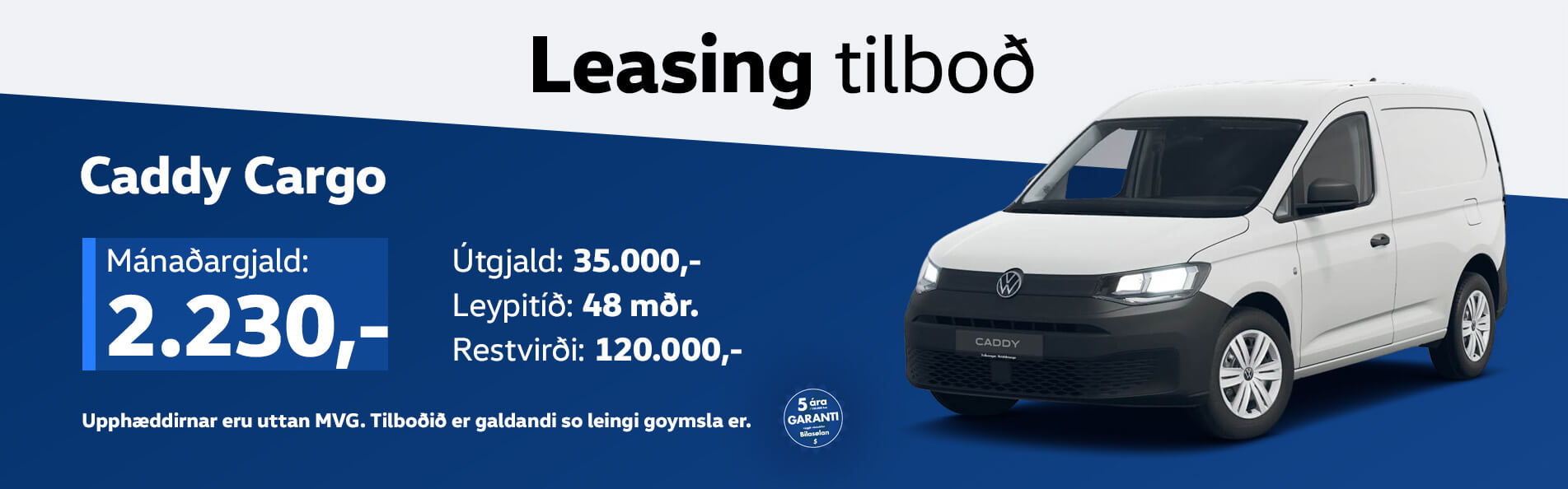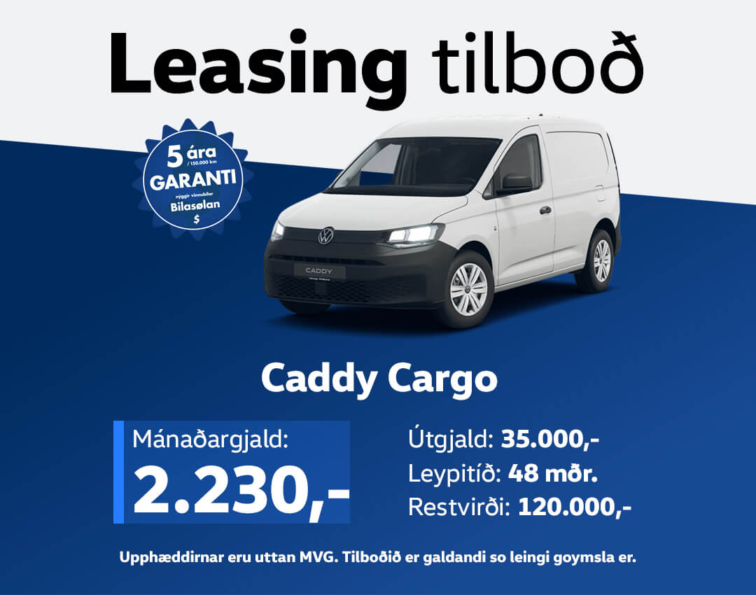 Á Bilasøluni hava vit hópin av góðum vinnubilum, sum tú kanst leasa. Eitt nú fleiri VW Caddy Cargo, sum kunnu leasast fyri einans 2.230 kr. um mánaðin (uttan MVG).
